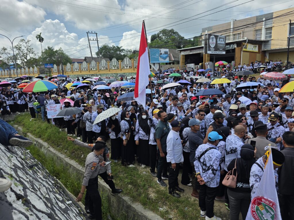 KENDARI, TEROPONGSULTRA.NET Ribuan guru yang tergabung dalam Persatuan Guru Republik Indonesia (PGRI) Sulawesi Tenggara (Sultra) menggelar aksi solidaritas besar besaran di depan Gedung Pengadilan Tinggi (PT) Sultra pada Rabu (17/12/2025).