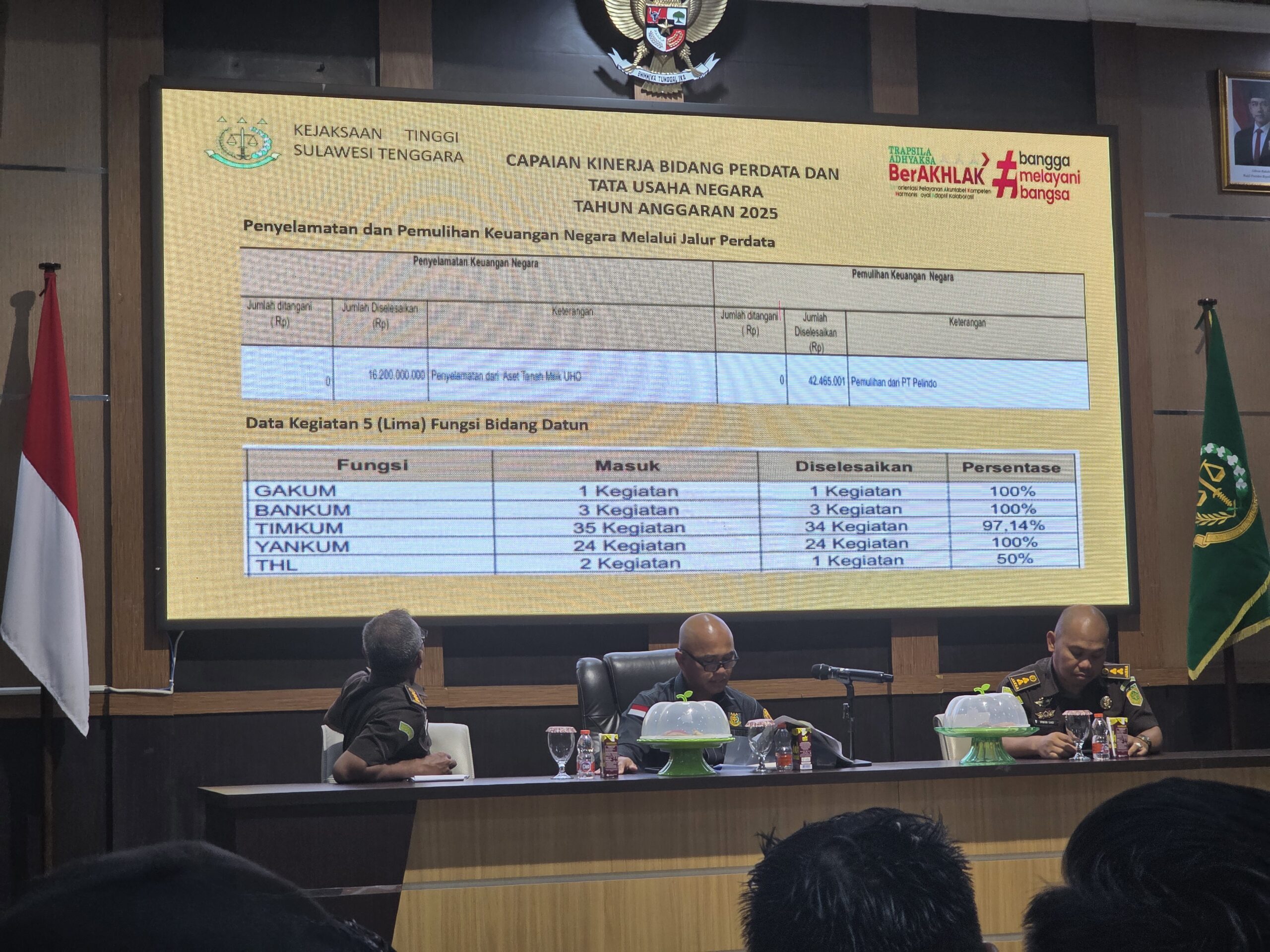 Dalam hal pemulihan aset, Kejati Sultra mencatatkan keberhasilan penyelesaian aset senilai Rp26.481.753.830 melalui jalur lelang, hibah, dan mekanisme lainnya.