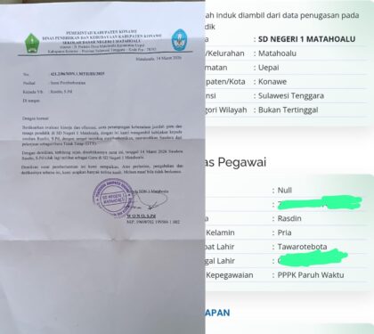 Berita | Pendidikan | • Maret 14, 2026 • Guru SD 1 Matahoalu di Konawe Diberhentikan Secara Mendadak KONAWE,TEROPONGSULTRA.NET – Seorang guru di SD Negeri 1 Matahoalu, Kecamatan Uepai, Kabupaten Konawe, Sulawesi Tenggara,...