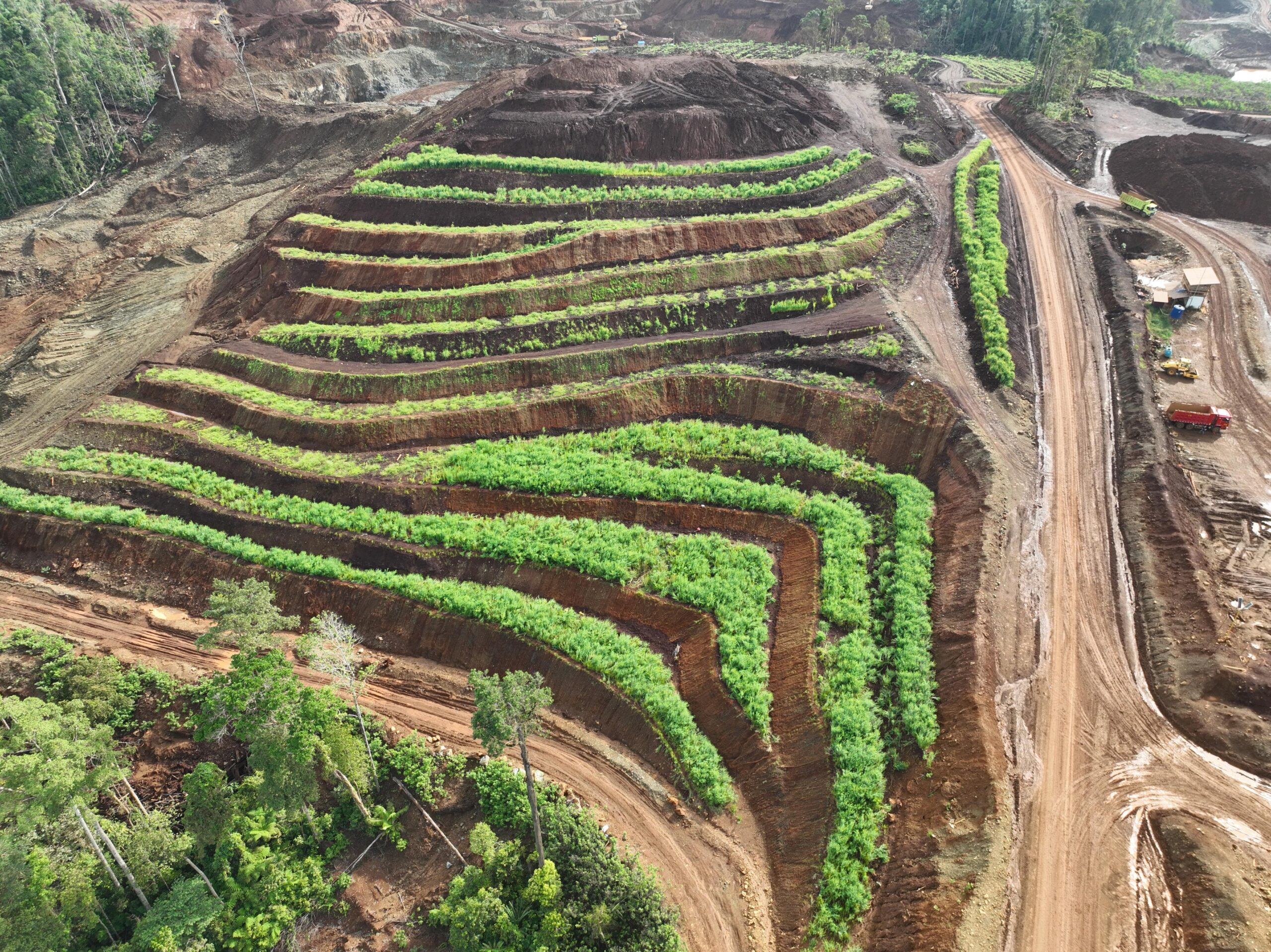 Proses tersebut meliputi grading, pembentukan kemiringan aman, pembuatan terasering, penguatan kaki lereng, hingga pembangunan sistem drainase untuk mencegah erosi dan potensi longsor.“Penataan lahan tidak bisa dilakukan tergesa-gesa. Keselamatan menjadi prioritas. Lereng harus stabil dulu sebelum dilakukan penebaran topsoil dan penanaman,” urai Badrus.